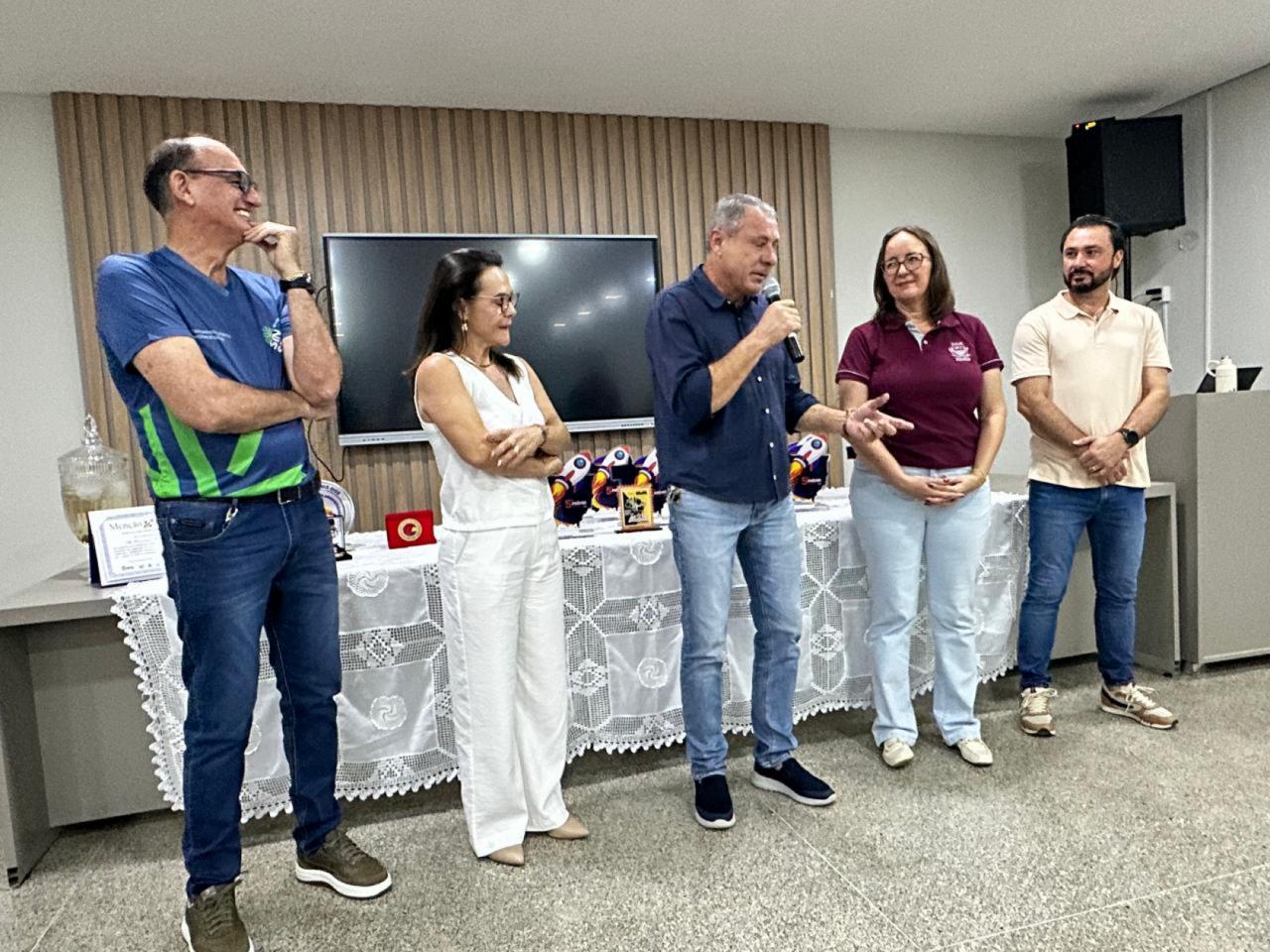 Nesta segunda-feira (27), foi realizado um café da manhã em celebração à premiação do 5º Seminário Municipal do Programa Alfabetiza MT, ao reconhecimento do município com o prêmio Prefeito Top 10, à conquista do Selo Ouro no Compromisso Nacional Criança Alfabetizada e ao prêmio de equidade. A solenidade contou com a presença do prefeito Alei Fernandes, do vice-prefeito Acácio, da secretária da Mulher e da Família, Mara Fernandes, da secretária de Educação, Adriana Reichert, além de professores e gestores escolares.